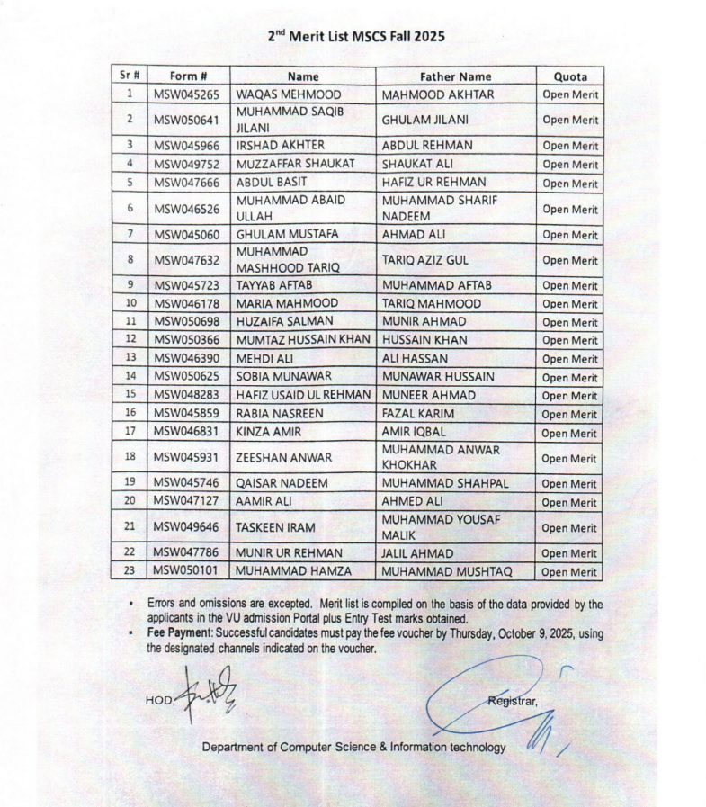 Uncategorized 2nd Merit List of MS Computer Science – Fall 2025 Semester ByMUDASSIR ASGHAR AWAN October 7, 2025February 23, 2026